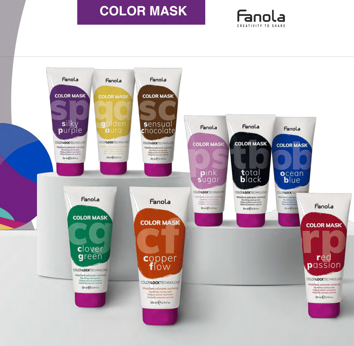 Maski Fanola Color są idealne do utrzymania i przedłużenia koloru pomiędzy wizytami w salonie. Zostały one opracowane przy użyciu ekskluzywnej „technologii blokady koloru”, która może wychwytywać metale ciężkie. W związku z tym zmniejszają utlenianie kolorów i wydłużają czasu utrzymywania się koloru nawet do 8-10 myć.